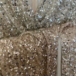 A show-stopping sequin gown belongs in every closet — and we’re partial to this magnificent ombré option. Covered from top to bottom in metallic sequins, this dress shines in so many ways. It’s designed with a V-neckline, cap sleeves, waist-whittling “belt” detail, and a thigh-high off-center slit.