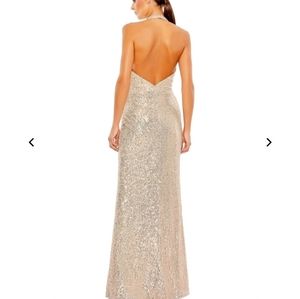 Floor-length sequined gown with a plunging v-neckline, wrap waist, and a thigh-high slit.