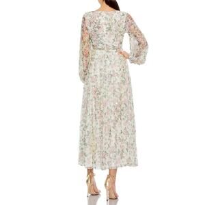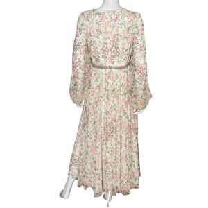 This dress features long blouson sleeves, adding a touch of elegance. The beaded waist detail enhances the silhouette, while the allover floral pattern, accented by clear hand-stitched sequins, brings a charming allure.