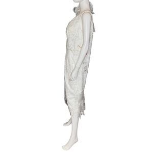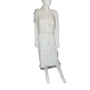 Mac Duggal White Floral Embellished V-neck Midi Dress with Shoulder Bow Sz 14