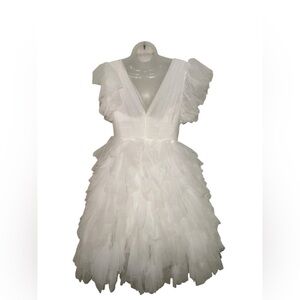 Mac Duggal White Tulle Ruffle Mini Dress 20505 Flutter Sleeve V-Neck Size 6 NWT