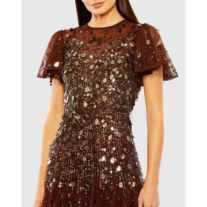 Mac Duggal Womens 20418 Flutter Sleeve Sheer Top Beaded Dress Midi Dress