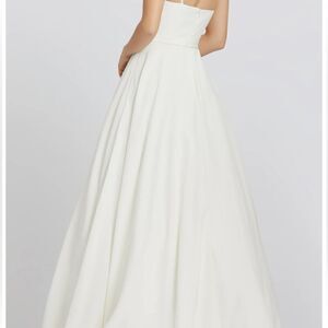 This crepe gown of understated elegance features a fitted bodice with a simple waistband atop the grandeur of a sweeping ballgown skirt.