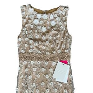 Features- sleeveless sheath dress includes a tan backing, with a sheer lace overlay accessorized by white floral and rhinestone beading. Natural waist is accented by further beading in a belt-like pattern