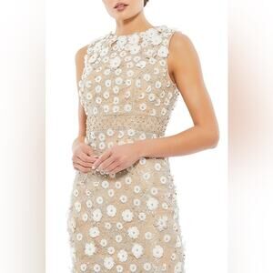 Tags- wedding guest dress, semi formal dress, bridal shower dress, courthouse wedding dress, beaded embellished dress, embellished sheath dress, floral beaded mac duggal dress, vow renewal dress, mother of the bride dress, mother of the groom dress, Mac duggal women’s nwt floral appliqué crewneck tan sleeveless midi dress style 67853