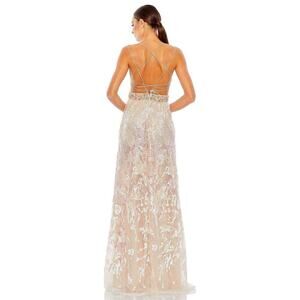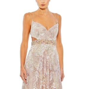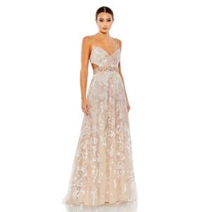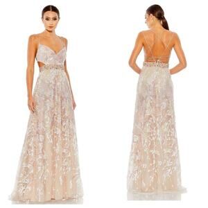 Mac Duggal Women's Oyster Deep V-neck Evening Dress Size 12 NWT. Make a memorable splash at your upscale evening event in this Mac Duggal 68051 creation. Decked with sequin and bead embellishments, this sleeveless stunner glows seductively even from afar. Supported by double thin straps, this alluring dress displays a deep V-neckline with side cut outs leading to a sultry back with strappy crisscross design and zipper closure. The embellished waistband cinched the waist as the skirt slips into a full-length hemline. Embrace a style that is immaculately sultry as you glam up for your event in this Mac Duggal creation. Model is wearing Oyster color.