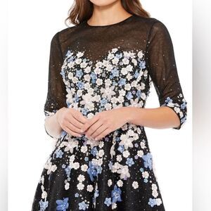A-line, tea-length cocktail dress with gorgeous floral applique, rhinestone accents, and semi-sheer 3/4 sleeves