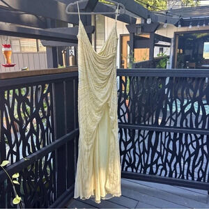 Mac Duggal Yellow Beaded Sequin Gown – Deep V Wrap Slit Formal Prom Dress NWOT