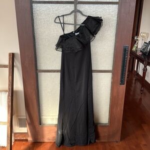 One shoulder evening gown features a ruffled asymmetrical neckline, body-skimming silhouette, and a thigh-high slit.