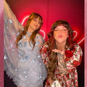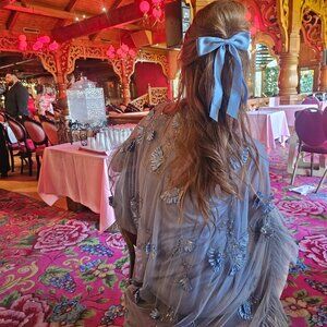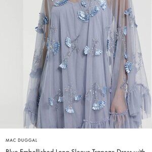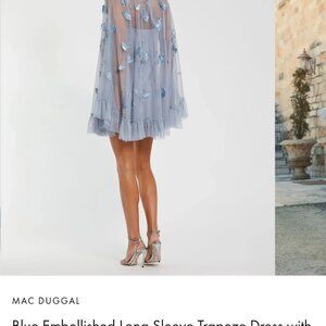 Blue slip dress with sheer overlay. Sheer overlay has beading and ribbon embellishments, and a ruffled hem. I got SO many compliments on this dress, multiple strangers asked me where it was from. Only worn once, just no room in my closet