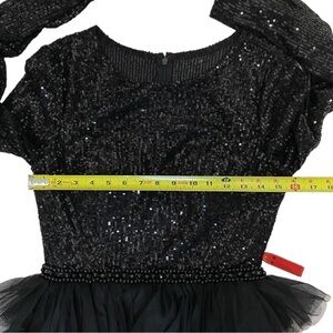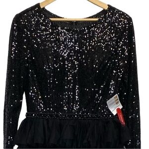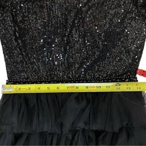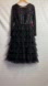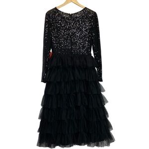 Mac Duggal long sleeve tiered ruffle midi dress with a high neckline, sheer sleeves, high neckline and a concealed back zipper. New with tags. Please see pictures for more details and measurements. Mac Duggal 27490.