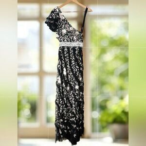 Mac Duggal Embroidered One Shoulder Gown Black Floral Strappy Lace up Dress NWT