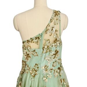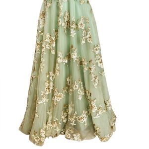 Stunning green tulle fit and flare gown with gold sequin and embroidered floral embellishment. One shoulder, layers of tulle, fully lined.