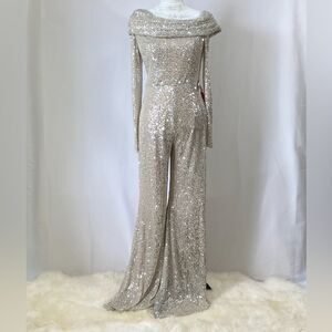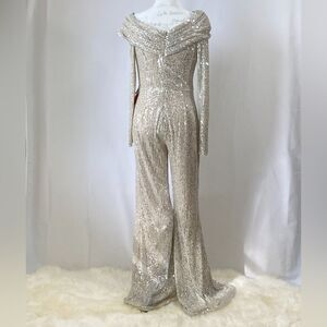 Mac Duggal Ieena Sequin One-Shoulder Long-Sleeve Jumpsuit size 8