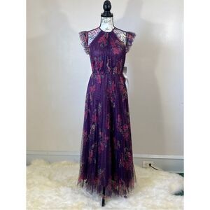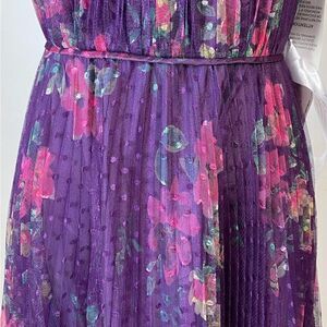 This A-line dress is crafted of a pleated dot tulle with a chic floral print.