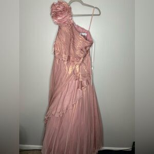 Size 12. New with tag. Still selling full price $498. This one-shoulder organza ballgown features a pleated bodice, waistband, rosette accent, and a full A-line skirt with tulle layers and cascading ruffles.
