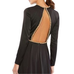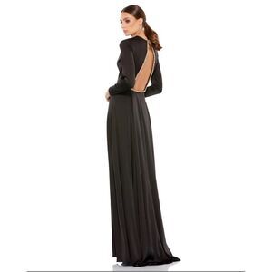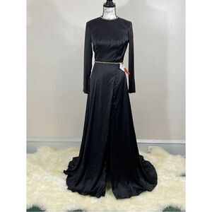Beguile from the very beginning when you enter in this alluring satin gown featuring a front slit, a triangle-shaped back cutout and a lingering train.