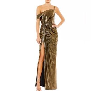Stunning one-shoulder gown in shimmering gold. Features a stylish side slit and ruched detailing.