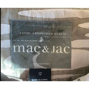 Mac & Jac Green and Gold Camouflage Jacket/Cardigan/Blazer, Peplum Shape, 3/4 Bell Sleeves, Button-Up. Jacket is cotton/poly/nylon blend with a polyester lining, lightweight and packable, machine washable, size 12.