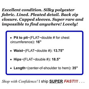Excellent condition. Silky polyester fabric. Lined. Pleated detail. Back zip closure. Capped sleeves. Super rare and impossible to find anywhere! Lovely!