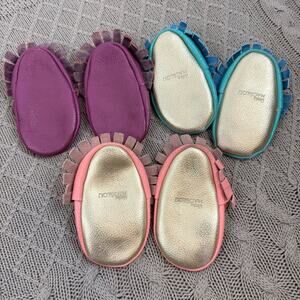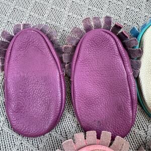 Adorable Mac and Lou (NOT freshly Picked, listed as such for visibility of listing) leather moccasins for kids in vibrant purple, teal, and pink. Perfect for little feet, offering comfort and style.