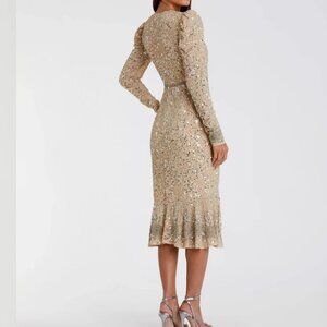 Mac duggal Beige Sequin Dress with Embellished Hemline and Belt