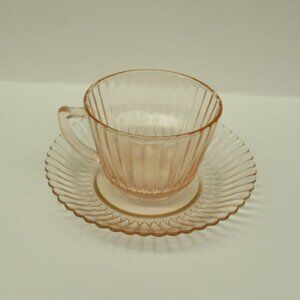 This pretty pink Petalware depression glass tea or coffee cup and saucer were made by MacBeth-Evans from 1930 to 1940. Both the cup and saucer are in very good condition with no chips, cracks or scratches. Be sure to search our other Petalware available.