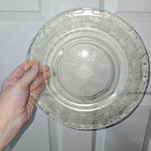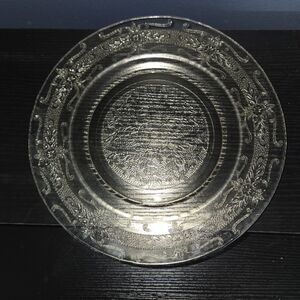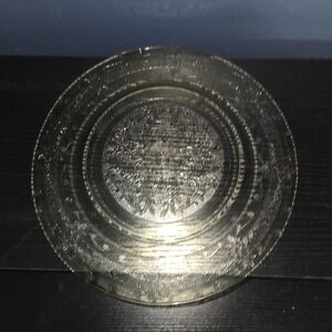 The product is a MacBETH EVANS S PATTERN STIPPLED ROSE BAND Yellow Plate, dating back to the 1930s. Made of glass, this decorative collectible features a striking yellow color with a rose band design. Perfect for collectors or those looking to add a unique touch to their decor, this vintage piece exudes elegance and charm. #glassdreamstlc