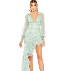 Mac Duggal 50744 V Neck Empire Sleeve High Low Dress Asymmetrical Ruffles