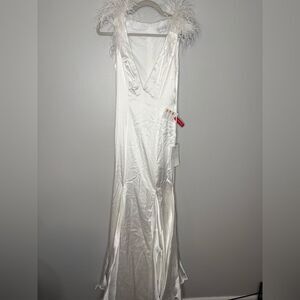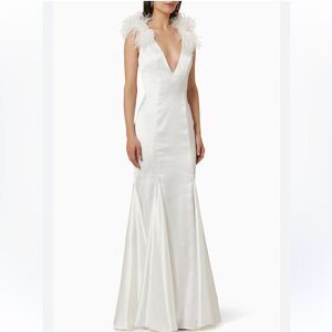 Size 0. New with tag. Feather trim long fitted formal mermaid gown with low v-neckline.