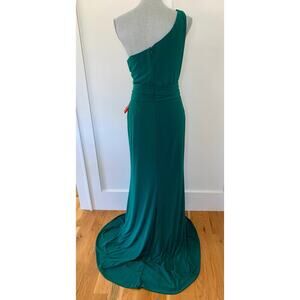 MacDuggal Ieena One Shoulder Jersey Gown in Green Size 8 Maxi Sheath Belted