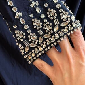 Chic navy blue gown with one-shoulder design. Features silver embellishments on sleeves. Elegant and stylish for formal events. High stretch for a comfortable all day wear.