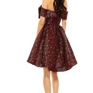 This stunning off-shoulder MacDuggal dress features a beautiful red hue, perfect for any special occasion. Its elegant design and rich deep red brocade make it a standout piece in any wardrobe.Style no 68622.