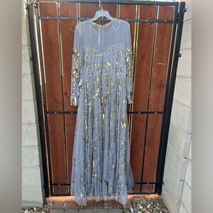 Mac Duggal Platinum Gold Long Sleeve Embellished Illusion Gown size 16 NWT