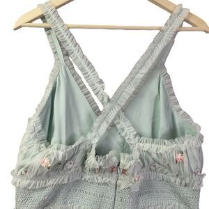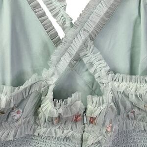 Mesh fabric overlay with allover floral embroidery and ruffles