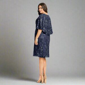 You'll be sizzling in this chic cocktail dress from MacDuggal. This style features shimmering navy and gunmetal sequins on a navy background, with a beautifully beaded waistband. Dramatic cape back and a sexy V neck. Brand new, with tags. I am a top-rated seller and ship quickly!