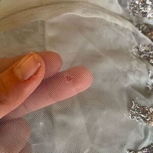 The dress is new with a tag but wit couple imperfections- the size tag is torn on one side and a small hole on the back not visible ( see pictures for details).