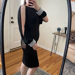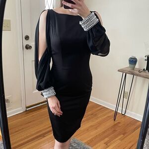 Features long sheer open sleeves, rhinestone Pearl cuffs, boat neckline, back slit, fitted, to the knee length, built-in bra padding