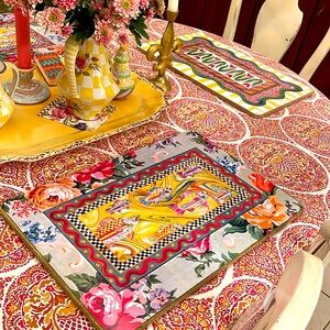 Pictures on Mats are by MacKenzie Childs Vintage 1983 conversation book/magazine. Clean surface with damp cloth. Oversized 18”x12”. I now have a set of Fish pattern in Kitchen and yellow floral in Dining room. New patterns soon