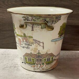 To celebrate its 30th anniversary, MacKenzie-Child introduced the Aurora collection of enamelware named after the Finger Lakes town in New York where the company is based. Aurora is a toile-like, vintage-inspired pattern in pastel colors that depicts pastoral scenes from MacKenzie-Childs’s headquarters, a 65-acre former dairy farm that overlooks Lake Cayuga. This is an enamel ice bucket with handles.