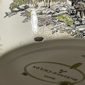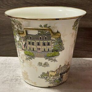To celebrate its 30th anniversary, MacKenzie-Child introduced the Aurora collection of enamelware named after the Finger Lakes town in New York where the company is based. Aurora is a toile-like, vintage-inspired pattern in pastel colors that depicts pastoral scenes from MacKenzie-Childs’s headquarters, a 65-acre former dairy farm that overlooks Lake Cayuga. This is an enamel ice bucket with handles.