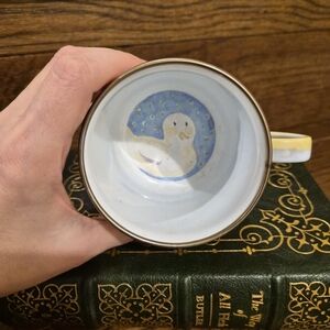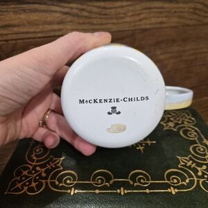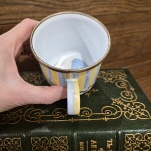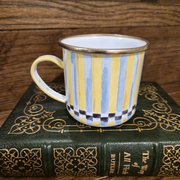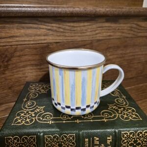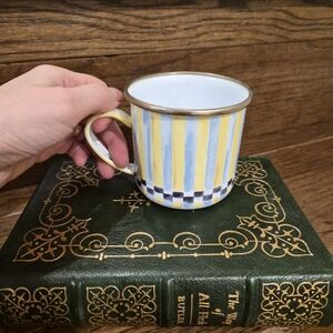 MacKenzie-Childs Blue Yellow Stripes Chess Pattern Duck Enamel Mug Retired