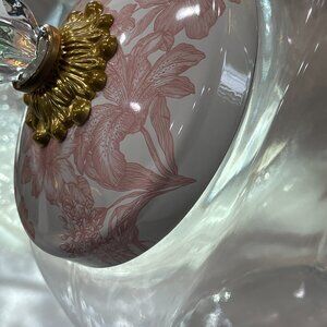 Glass bowl with a graceful tilt, topped by a blush floral toile lid, gilded rosette, and faceted clear knob.