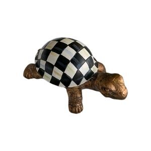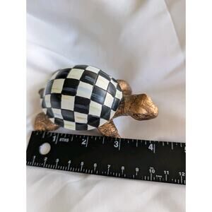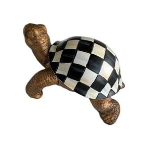 The MacKenzie-Childs Turtle Pot Climber is a small decorative collectible made of ceramic and porcelain, featuring a unique multi-color courtly check design. This novelty piece adds a touch of whimsy to any space with its original style and pottery material. Perfect for collectors looking for a charming and playful addition to their decor.