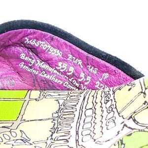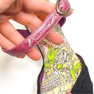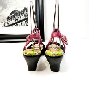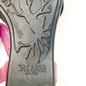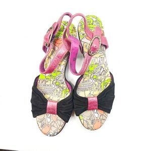 Add a pop of vintage flair to your wardrobe with these unique Macanna Italy heels, size 5.5 (EU 35.5). Featuring a striking mix of pink leather straps, black bow detailing, and a vibrant, artistic insole, these heels are perfect for adding a quirky, artsy touch to any outfit. The comfortable mid-heel and adjustable strap make them both fashionable and functional.