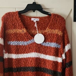 Macaron V Neck Long Striped Pulled Knit Sweater