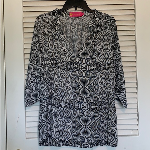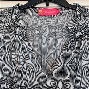 Silky patterned blouse from Macbeth Collection. Excellent Condition! V neck in the front is very flattering.