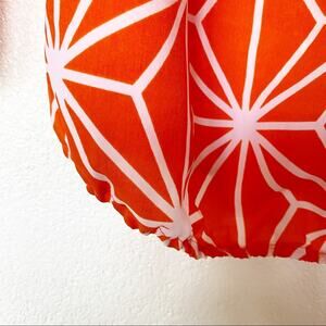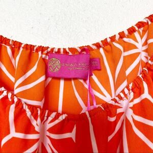 Bright orange and white graphic top from Macbeth Collection by Margaret Josephs. Elasticized top and cuffs. Super lightweight, perfect for warm seasons and warm climates! Orange base with white allover print. Keyhole detail in front.