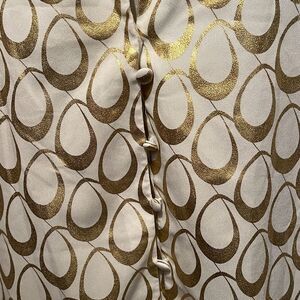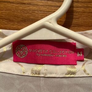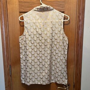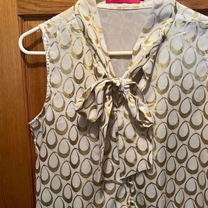 This beautiful top is made by Macbeth Collection by Margaret Josephs. It’s a white sleeveless blouse with gold swirls, a tie at the neck and little buttons down the front. Size medium and in excellent pre owned condition. Smoke and pet free home.