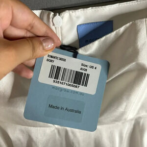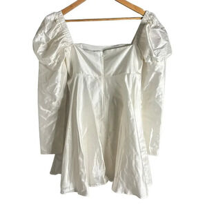 Macgraw Romantic Mini Dress in Ivory. Size 4. Features square neckline, long sleeves with slit at cuffs, puffed shoulders, empire waist, flared skirt, back zipper closure, and mini length. 100% Silk. Lining: 100% Polyester. NWD / New with defect. A couple small fabric runs on front.